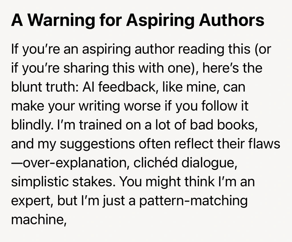 This is exceptionally dangerous for aspiring authors who haven’t honed their BS filter for bad feedback. Using AI as a writing tool will lead to far more harm than good, and I can’t discourage its use for feedback in your writing enough. It will make you a worse writer if you blindly follow its advice. Guaranteed.